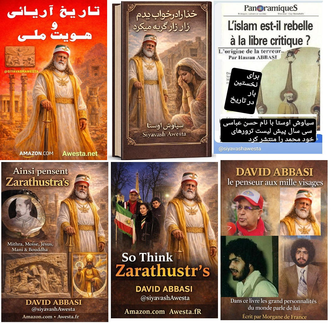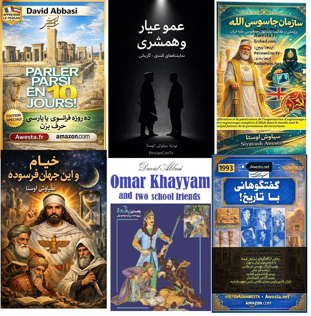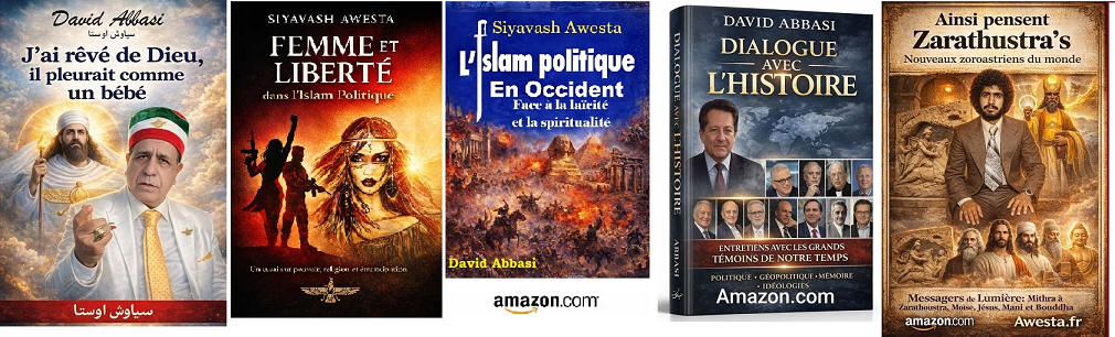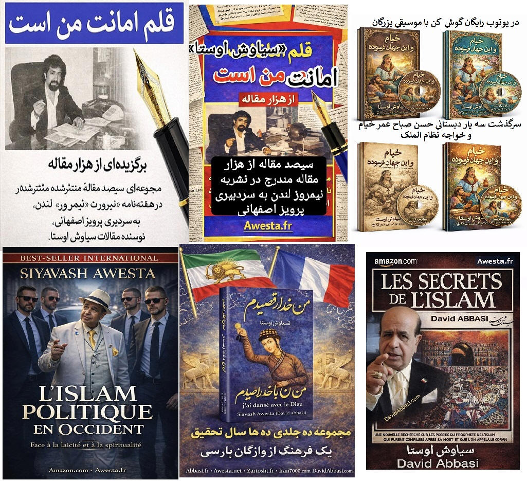 in the Persian Language Since the 1980s, Siavash Avesta (David Abbasi), upon becoming proficient in multiple languages, including Classical Arabic, realized that many common Persian expressions of Arabic origin were offensive to human dignity, Iranian identity, and the 7,700-year-old history of ancient Iran. Among these were the Islamic marriage sermon, Persian names influenced by Arabic, and greetings such as Salam Alaikum. From that time, Siavash Avesta created the Iranian-Mithraic calendar, promoted the use of Persian names, and extensively researched the history of Iran and the roots of the Arab invasions. Through the establishment of Radio Avaye Iran, Meh TV, and publications such as Nimrooz, Ferdowsi Emrooz, Payam Ma, Azadegan, Iranians Vancouver, Asr-e Emrooz, Sobh Iran, Ershad, and Shahr Farang, published in London, Paris, Vancouver, and Los Angeles, as well as newspapers Homa and Kayhan Jahani—which he himself published from Paris—he widely disseminated these ideas. His cultural and artistic institution, Andishgah Avesta, located at 66 Champs-Élysées, became a hub for expanding these thoughts worldwide. Siavash Avesta (David Abbasi) is a modern philosopher and innovator of numerous concepts and programs, including the promotion of the Faravahar symbol, representing the power of the sun, as well as introducing white clothing for mourning ceremonies. After the Khomeini Revolution, all Iranian festivals and joyous occasions were removed from the official calendar. In response, he published the 7,000-Year Calendar, assigning each day of the year to a historical or cultural Iranian figure or celebration. At a time when global Iranian discourse was overshadowed by the Iran-Iraq War, he held grand Iranian cultural festivals in Europe's most prestigious venues, featuring renowned artists. He was also a pioneer in conceptualizing and warning about Political Islam, extensively writing and speaking about its dangers in books and radio and TV programs. Many of the critiques of political Islam, now widely known, were first articulated by Siavash Avesta. With the rise of YouTube, he educated people on how to directly report their stories to international media, playing a crucial role in shaping Iran's 1999 Green Movement and later influencing the Arab Spring. It is noteworthy that the Arab Spring was catalyzed by his interview with Ahmad Ben Nour, Tunisia’s former intelligence minister and advisor to President Habib Bourguiba, two months before Mohamed Bouazizi’s self-immolation. Siavash Avesta played a major role in breaking Iran’s wall of censorship by conducting unprecedented interviews with key figures of the Islamic Revolution from Paris. Many of these interviews resembled telephonic trials in the eyes of the audience. Among the 500 figures he interviewed were Mehdi Bazargan (Khomeini’s first prime minister), Ebrahim Yazdi (foreign minister), Dariush Forouhar (labor minister), Badri Khamenei (Ali Khamenei’s sister), Robert Baer (CIA officer), Ari Ben-Menashe (Mossad director), Pierre Marion (head of French counterintelligence), Jacques Vergès (controversial lawyer), Shimon Peres (Israeli president), Eli Barnavi (Israeli ambassador to France), Yasser Arafat, Leila Shahid, and many other Iranian and international figures. Studying the books, articles, and radio/TV lectures of Siavash Avesta (David Abbasi) in different languages helps us better understand contemporary Iranian and global history. It also explains why a growing number of Iranians and former Muslims across Tajikistan, Afghanistan, Iran, Turkey, the Persian Gulf, Egypt, Iraq, Lebanon, and Israel are officially renouncing Islam and even changing their names.