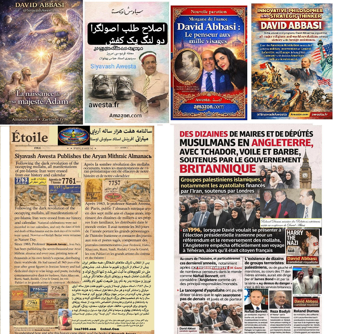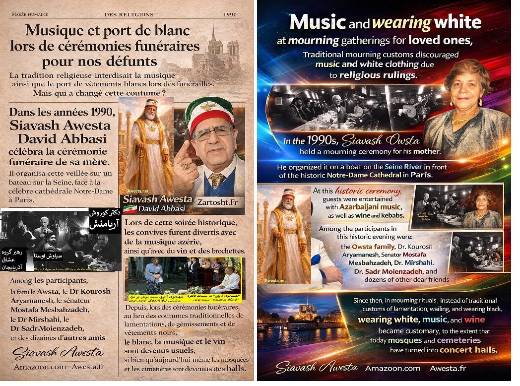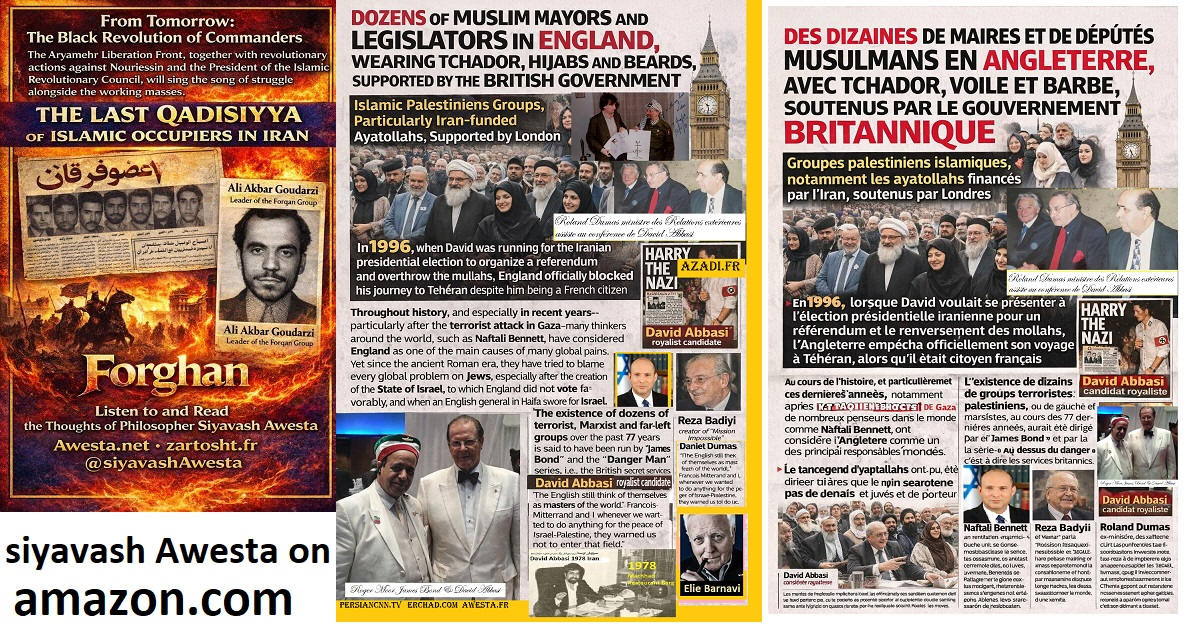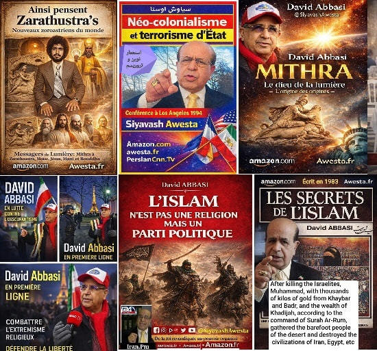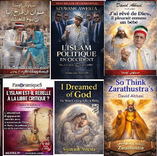 in the Persian Language Since the 1980s, Siavash Avesta (David Abbasi), upon becoming proficient in multiple languages, including Classical Arabic, realized that many common Persian expressions of Arabic origin were offensive to human dignity, Iranian identity, and the 7,700-year-old history of ancient Iran. Among these were the Islamic marriage sermon, Persian names influenced by Arabic, and greetings such as Salam Alaikum. From that time, Siavash Avesta created the Iranian-Mithraic calendar, promoted the use of Persian names, and extensively researched the history of Iran and the roots of the Arab invasions. Through the establishment of Radio Avaye Iran, Meh TV, and publications such as Nimrooz, Ferdowsi Emrooz, Payam Ma, Azadegan, Iranians Vancouver, Asr-e Emrooz, Sobh Iran, Ershad, and Shahr Farang, published in London, Paris, Vancouver, and Los Angeles, as well as newspapers Homa and Kayhan Jahani—which he himself published from Paris—he widely disseminated these ideas. His cultural and artistic institution, Andishgah Avesta, located at 66 Champs-Élysées, became a hub for expanding these thoughts worldwide. Siavash Avesta (David Abbasi) is a modern philosopher and innovator of numerous concepts and programs, including the promotion of the Faravahar symbol, representing the power of the sun, as well as introducing white clothing for mourning ceremonies. After the Khomeini Revolution, all Iranian festivals and joyous occasions were removed from the official calendar. In response, he published the 7,000-Year Calendar, assigning each day of the year to a historical or cultural Iranian figure or celebration. At a time when global Iranian discourse was overshadowed by the Iran-Iraq War, he held grand Iranian cultural festivals in Europe's most prestigious venues, featuring renowned artists. He was also a pioneer in conceptualizing and warning about Political Islam, extensively writing and speaking about its dangers in books and radio and TV programs. Many of the critiques of political Islam, now widely known, were first articulated by Siavash Avesta. With the rise of YouTube, he educated people on how to directly report their stories to international media, playing a crucial role in shaping Iran's 1999 Green Movement and later influencing the Arab Spring. It is noteworthy that the Arab Spring was catalyzed by his interview with Ahmad Ben Nour, Tunisia’s former intelligence minister and advisor to President Habib Bourguiba, two months before Mohamed Bouazizi’s self-immolation. Siavash Avesta played a major role in breaking Iran’s wall of censorship by conducting unprecedented interviews with key figures of the Islamic Revolution from Paris. Many of these interviews resembled telephonic trials in the eyes of the audience. Among the 500 figures he interviewed were Mehdi Bazargan (Khomeini’s first prime minister), Ebrahim Yazdi (foreign minister), Dariush Forouhar (labor minister), Badri Khamenei (Ali Khamenei’s sister), Robert Baer (CIA officer), Ari Ben-Menashe (Mossad director), Pierre Marion (head of French counterintelligence), Jacques Vergès (controversial lawyer), Shimon Peres (Israeli president), Eli Barnavi (Israeli ambassador to France), Yasser Arafat, Leila Shahid, and many other Iranian and international figures. Studying the books, articles, and radio/TV lectures of Siavash Avesta (David Abbasi) in different languages helps us better understand contemporary Iranian and global history. It also explains why a growing number of Iranians and former Muslims across Tajikistan, Afghanistan, Iran, Turkey, the Persian Gulf, Egypt, Iraq, Lebanon, and Israel are officially renouncing Islam and even changing their names.
