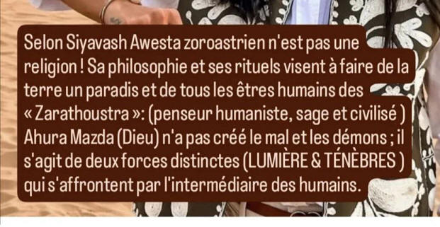 -Le Zoroastrisme n'est pas une Religion -Zarathoustra n'est pas un envoyé de Dieu.Pas l'enfer ni le paradis…Tu les fabriques ici & maintenant… Join countless Thought ZARATHOUSTRA world- Joignez-vous à d'innombrables Pensée de ZARATHOUSTRA du monde Institut Awesta - 66 av des CHAMPS ELYSEES 75008 Paris FRANCE Tel: 01 45 63 02 63 - 06 87 81 61 44 بدان که تو زرتشتی هستی ولی باید زرتشت بشوی سیاوش اوستا از پنجاه سال پیش بر این باور بوده است که هر انسان آزاده و خردمند و اندیشمندی از هر دین و آئینی زرتشتی هست اما باید با پژوهش و آموزش و دانش اندوزی اندیشمند شود نه دانشمند و که پس از اندیشمندی زرتشت شدن است باید تو خود نیز یک زرتشت زمانه باشی
