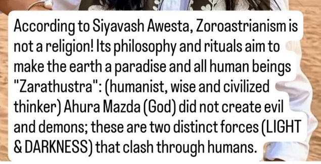 العالم (الزرادشتية الحديثة). الزرادشتية الحديثة ليست ديانة، بل هي، وفقًا