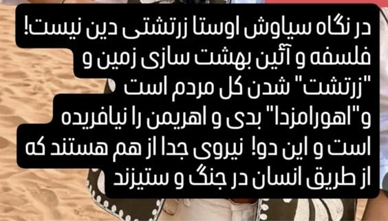 La doctrine de Zoroastre ne peut être considérée comme une religion mais une Pensée rationnelle, une pensée qui est conforme à l'expérience, qui n'entre pas en contradiction avec l'expérience, ni avec la réalité objective, pour bien vivre, penser bien, parler bien et pratiquer bien pour créer le paradis ici et maintenant dans une fraternité et égalité et la paix mondiale … در نگاه سیاوش اوستا زرتشتی دین نیست آئین و فلسفه ساخت بهشت اینجا و حالامیباشد |