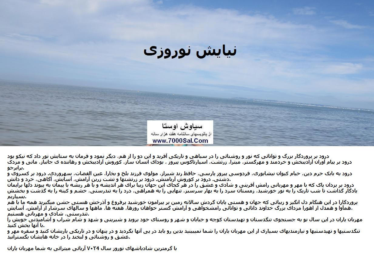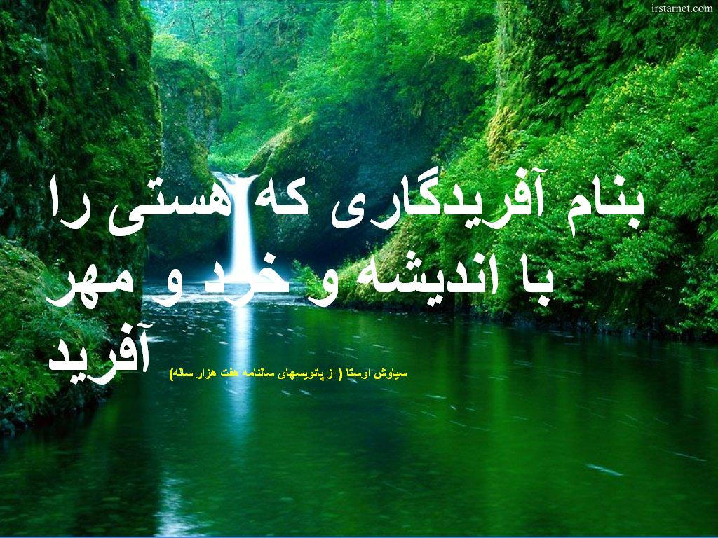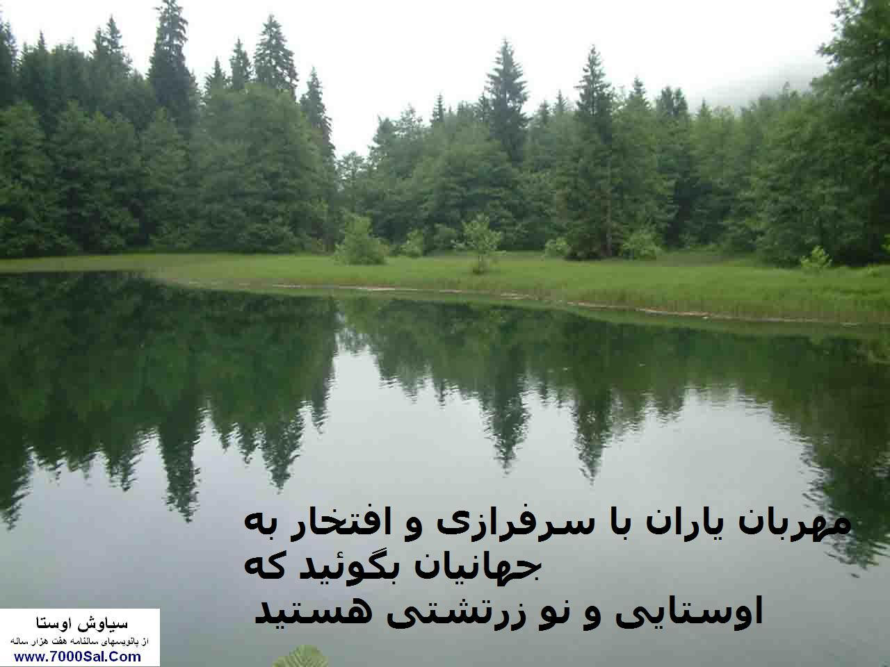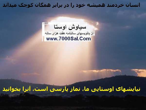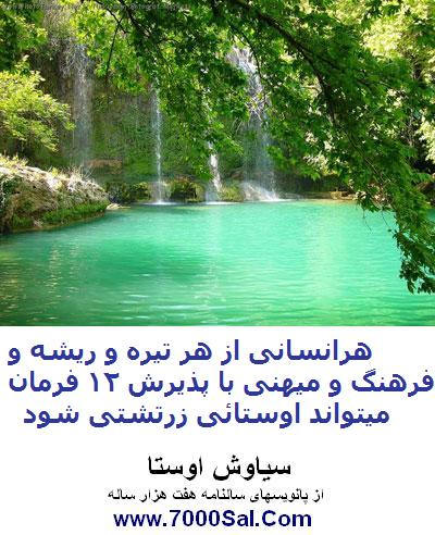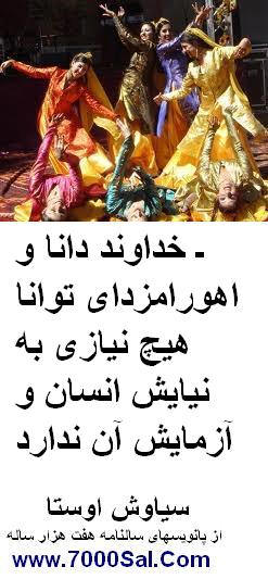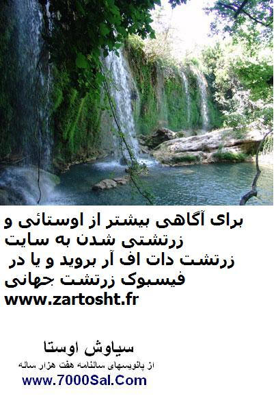 استاد سیاوش اوستا رهبر جهانی نوزرتشتی ها نخستین کسی بود که در دو.ران ما اندیشه و تاریخ ایران گرائی و تمدن و فرهنگ باستان را زنده کرده و تاریخ هفت هزار ساله را پایه گذاری کرد و راه نوینی را در خرد آریایی و نقد اسلام تازی برای بشریت گشود ایشان با بهره وری از نوشته ها و برنامه هایش بزبانهای پارسی و فرانسوی توانست میدان اندیشه اش را در سراسر جهان گسترش دهد امروزه عناصر و شخصیتهای ایرانی و بیگانه در گوشه و کنار این جهان اهورائی در پست ها و موقعیتهای حساس هزاران هزارانند که از نوپردازیهای کدبان استاد سیاوش اوستا بهره ها برده اند این سخنان کوتاه چکیده ای از تفکر ایشان است که در حدود 120 جلد کتاب و هزاران مقاله و صدها ساعت برنامه های رادیویی و تلویزیونی در 35 سال گذشته پخش شده است چند سایت اینترنتی که آثار استاد سیاوش اوستا را مینمایاند www.mehrtv.com www.faryad.net www.zartosht.fr www.azadi.be www.awesta.net www.7000sal.com |